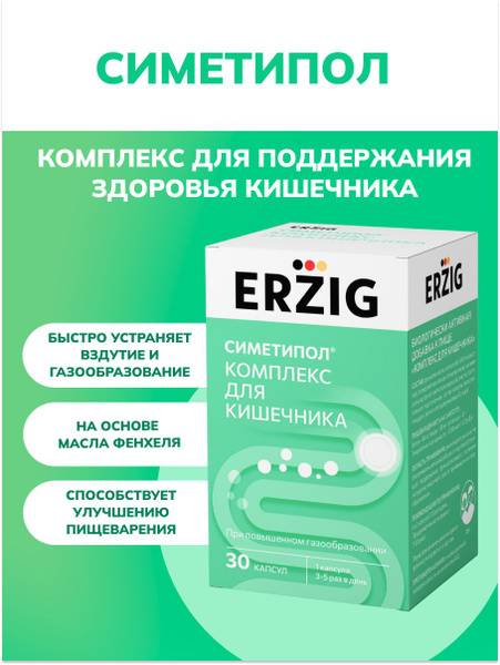 Simetipol ERZIG Intestinal Complex is a dietary supplement formulated to alleviate gas and bloating. This scientifically-backed formula combines fennel oil, a traditional remedy for gas and spasms, with a modern, safe, and effective defoaming agent (polydimethylsiloxane + silicon dioxide). Simetipol reduces gas buildup in the gastrointestinal tract by decreasing surface tension, allowing gas bubbles to merge and dissipate naturally. It's gentle on the digestive system, doesn't interfere with nutrient absorption, and is suitable for various conditions including functional dyspepsia and post-operative gas. Experience effective, natural relief from gas, bloating, and discomfort.