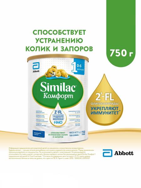 Keywords: Similac Comfort 1, infant formula, colic relief, constipation relief, baby formula, partially hydrolyzed whey protein, 2'-FL, oligosaccharides, immune support, probiotics, prebiotics, DHA, ARA, lutein, nucleotides, no palm oil, hypoallergenic, gas relief, formula feeding, Abbott, baby nutrition, infant health, Russia, 750g, 0-6 months, digestive health, gut health, healthy digestion