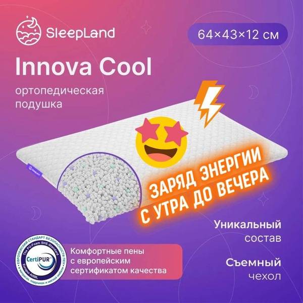 Wake up refreshed and rejuvenated with the SleepLand Innova Cool orthopedic pillow. This expertly crafted 43x64cm pillow, featuring a 12cm height, combines the benefits of memory foam, cooling gel, and supportive polyfill for ultimate comfort and spinal alignment. The unique blend of materials gently cradles your head and neck, conforming to your individual contours for personalized support. Cooling technology helps maintain a comfortable sleep temperature, while the resilient core provides reliable support for your upper spine.