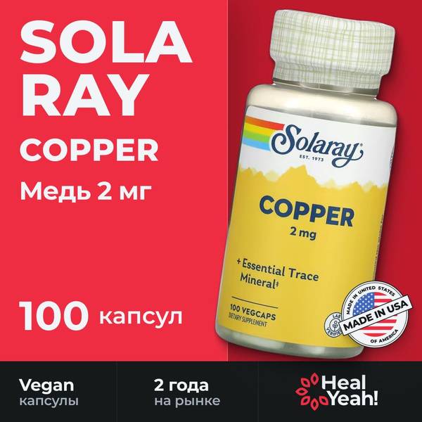 Solaray, copper supplement, copper capsules, copper chelate, vegan supplement, vegetarian capsules, vitamins, minerals, dietary supplement, USA made, trace mineral, essential nutrients, health supplements, nutritional support, 2mg copper, 100 capsules, Solaray copper, хелат меди, медь в капсулах, витамины из США