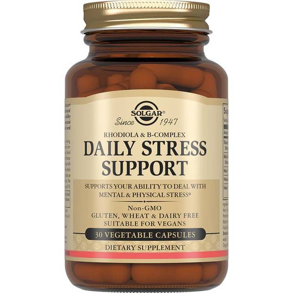 Keywords: Solgar, Daily Stress Support, stress relief, stress management, adaptogen, Rhodiola Rosea, Rhodiolife, B vitamins, Panmol B-Complex, cognitive function, memory, focus, concentration, energy, fatigue, sleep, natural supplement, vegetable capsules, 30 count, stress resilience, mental well-being, natural stress relief, anxiety support.