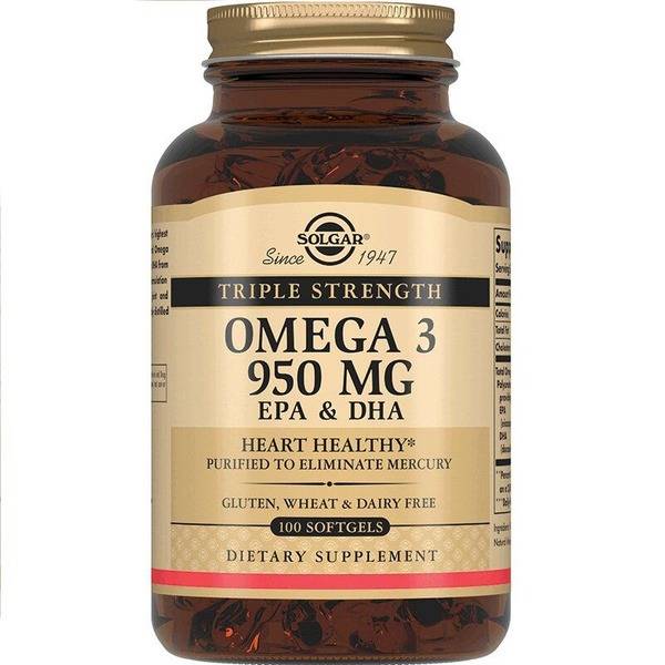Solgar, Omega-3, EPA, DHA, fish oil, heart health, brain health, eye health, skin health, cholesterol, hyperlipidemia, eczema, psoriasis, molecular distillation, gluten-free, wheat-free, dairy-free, softgels, supplements, dietary supplement, healthy fats, polyunsaturated fatty acids, PUFAs, 950mg, triple strength, Solgar Omega 3, Omega-3 950mg, Solgar Omega-3 EPA DHA.