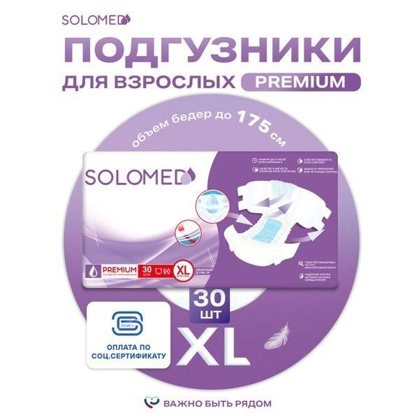 Description: Solomed Premium adult diapers, size XL (30 count), provide superior absorbency and overnight protection for individuals with a waist circumference of 150-175cm. These unisex, disposable adult diapers are designed for comfort and reliability for men and women of all ages and health conditions, including those who are bedridden. The form-fitting design ensures a comfortable and secure fit for a wide range of body types. Made with breathable materials to prevent rashes and odor, these diapers feature a wetness indicator, elastic leg openings for a snug fit, and a superior leak-guard system. Solomed Premium adult diapers are hypoallergenic and safe for sensitive skin. These high-quality diapers meet stringent standards and are eligible for purchase with FSS and TSR certificates. A range of sizes are available.