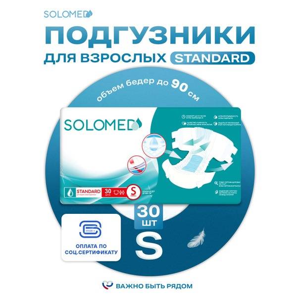Solomed Standart S adult diapers offer superior comfort and protection for individuals experiencing incontinence. This 30-count pack of size S diapers is designed for a waist circumference of 70-90cm and is suitable for both men and women of all ages and health conditions. These absorbent adult briefs feature a comfortable, universally-fitting design that accommodates most body types. The high absorbency ensures all-day and nighttime dryness, providing peace of mind for those with light to moderate incontinence. Made with breathable, hypoallergenic materials, Solomed diapers minimize the risk of skin irritation and odor. Secure elastic leg cuffs and a comfortable waistband provide a reliable fit, preventing leaks and ensuring discreet wear, even for bedridden individuals. A wetness indicator conveniently signals when a change is needed. Solomed adult diapers are manufactured to the highest quality standards and are eligible for purchase using social security and long-term care insurance certificates (where applicable). Explore our full range of certified adult diaper sizes.