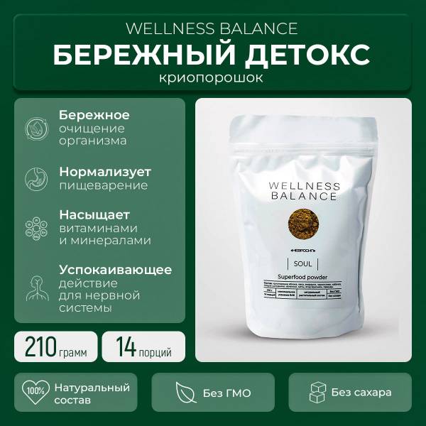Wellness Balance Soul is a natural, plant-based supplement promoting gentle relaxation and improved sleep. Rich in natural magnesium and B vitamins, it supports healthy nervous and cardiovascular systems. Ingredients include cryo-powdered apple, oat, amaranth, prune, zucchini, rosehip, sea buckthorn, mint, cranberry, and lavender. Experience the benefits of apple's iron and vitamin C, oat's soothing properties, amaranth's calcium and iron content, prune's immune support, zucchini's skin-toning effects, rosehip's metabolism boost, mint's antioxidant power, cranberry's mood-lifting qualities, and lavender's calming influence. Regular use may help normalize cardiovascular function, improve sleep quality, and promote nervous system relaxation. Wellness Balance Soul is ideal for stress management and better sleep. Try it today and feel the difference!