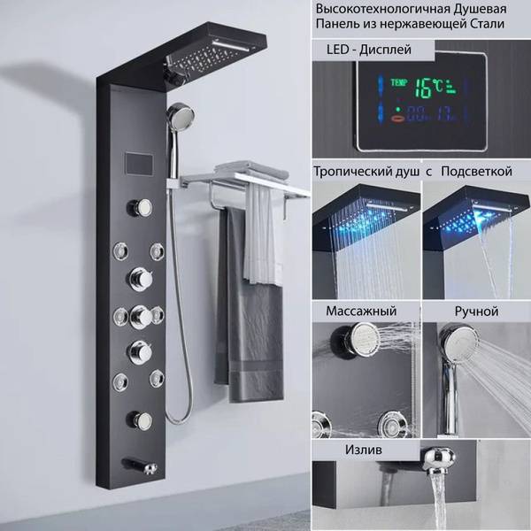 Keywords: Southlife Novo, shower panel, hydro massage shower, rainfall showerhead, handheld shower, stainless steel shower, black shower panel, LED shower, bathroom renovation, spa shower, shower system, luxury shower, modern shower, bathroom accessories, relaxation, massage shower, durable shower.