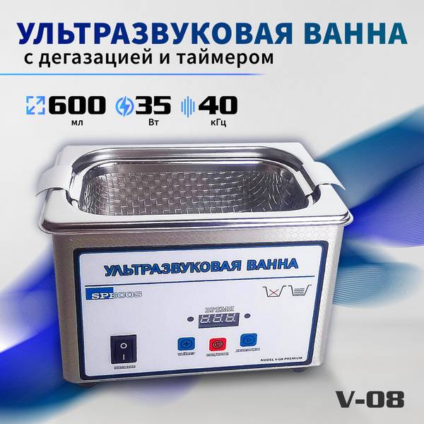 Ultrasonic cleaner, ultrasonic bath, ultrasonic cleaning, Specos V-08, 0.6 liter ultrasonic cleaner, metal cleaning, jewelry cleaning, degassing, digital timer, stainless steel ultrasonic cleaner, 40kHz ultrasonic cleaner, 35W ultrasonic cleaner, ultrasonic parts cleaner, ultrasonic wash, premium ultrasonic cleaner, CE certified, EMC certified, RoHS certified, FCC certified.