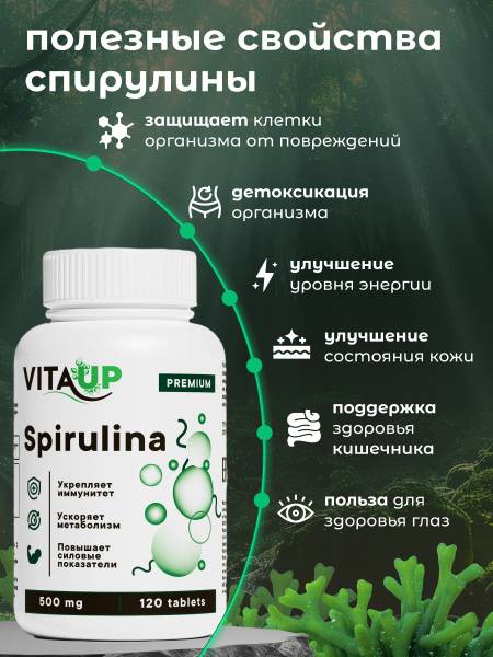 spirulina, spirulina tablets, spirulina 500mg, spirulina supplement, vitamins, minerals, antioxidants, superfood, blue-green algae, immune support, energy boost, detox, plant-based protein, health supplement, Vita UP Spirulina, 120 tablets