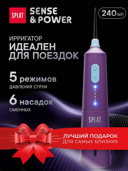 "description": "Experience superior oral hygiene with the SPLAT Sense&Power portable, waterproof oral irrigator. This cordless device features a built-in timer, USB charging, and six interchangeable nozzles for comprehensive cleaning. Effectively remove plaque and bacteria from teeth, gums, and tongue, reducing bleeding, inflammation, and bad breath. Ideal for daily use, braces, and implants. The 240ml reservoir with integrated filter provides enough water for a single session. Safety features include automatic shut-off when water runs low and a low-battery indicator. Choose from five cleaning modes: HIGH (gum massage), NORMAL (deep cleaning), SOFT (daily care), LOW (ortho users), and PULS (sensitive teeth/gums). Clinically proven to reduce bleeding by 2.5x, inflammation by 2x, improve plaque removal from enamel by 33%, and interdental cleaning by 78%. Includes 2 classic nozzles, 1 orthodontic nozzle, 1 tongue cleaner, 1 plaque remover, and 1 periodontal nozzle.",