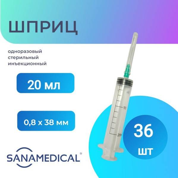 SANAMEDICAL 20 mL sterile disposable syringes are designed for subcutaneous and intramuscular injections, as well as other therapeutic and diagnostic procedures. These three-part syringes are made from special polypropylene and are individually sterilized and packaged.