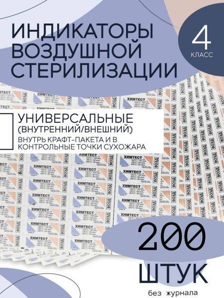 High-quality SitMedical "KhimTest" multivariable indicators for reliable visual monitoring of dry heat sterilization processes. This pack contains 200 indicators, designed for use in air sterilizers (dry heat ovens) at various temperatures and times: 160°C/150 min, 180°C/60 min, and 200°C/30 min. These Class 4 indicators (according to GOST ISO 11140-1) offer versatile placement options – within the sterilizer chamber, individual packages, instrument sets, or alongside sterilized items. A self-adhesive backing ensures secure attachment to monitoring points and archival documentation. The indicator irreversibly changes color upon successful sterilization. Expiry date: 60 months. Registration certificate: RZN 2019/8352 (May 7, 2019). TU 20.59.52-001-35927791-2017. Sold without form No. 257/y logbook.