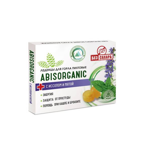 ABISORGANIC Pine Lozenges are a natural dietary supplement containing extracts from young pine branches, enriched with medicinal hyssop and mint. These lozenges are formulated to support respiratory health and provide a refreshing, cooling effect.