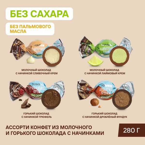 Tomer chocolate candy assortment offers a curated mix of milk and dark chocolate pieces with praline fillings, crafted without sugar and palm oil. Natural flavors and cocoa-based recipes provide a smooth, refined finish in a decorative cardboard box.