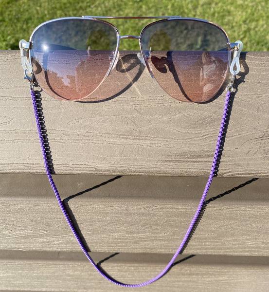 A stylish and practical accessory designed for securing glasses, this glasses holder features decorative elements and silicone loops for a secure fit. It is ideal for use with prescription glasses, sunglasses, or as a fashionable addition when wearing face masks.