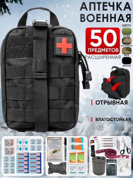 This waterproof, heavy-duty first aid kit is meticulously designed for immediate emergency response in diverse environments, from military operations to outdoor adventures. Boasting a robust 50-item configuration, this survival kit includes essential components for managing severe injuries and trauma. The kit features a durable, organized design, ideal for quick access in high-pressure situations. It contains a tourniquet, tactical shears, multiple sterile bandages, burn gel, antiseptic wipes, airway tubes, a rescue blanket, various dressings, and more. This compact yet comprehensive kit is perfect for hikers, campers, hunters, drivers, military personnel, and anyone seeking reliable emergency medical preparedness. This high-quality kit goes beyond standard first aid, making it an invaluable asset for extreme sports enthusiasts, adventurers, and preppers.