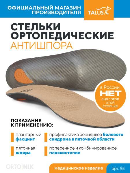 Experience superior comfort and targeted pain relief with Talus Anti-Spur Orthotic Shoe Insoles (Art. 93). Designed for both men and women, these supportive insoles are essential for the treatment and alleviation of pain associated with any type of heel spur, longitudinal, and combined flatfoot.