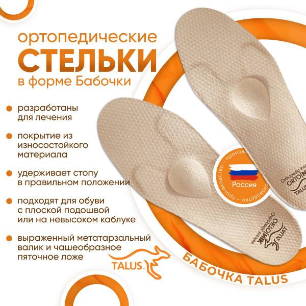 A multi-layered frame made of thermoplastic material with "butterfly"-shaped protrusions and a specially designed metatarsal pad relieves the forefoot, easing metatarsalgia symptoms. The cup-shaped heel keeps the foot in the correct position. Support of the longitudinal and transverse arches reduces shock load on the foot, knee, and hip joints.
