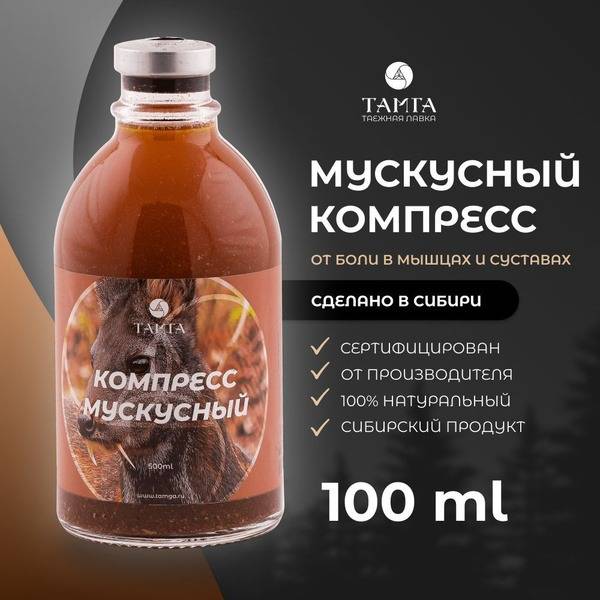 Experience powerful relief from muscle and joint pain with TAMGA Musk Compress. Developed with input from experienced biologist-hunter Sergey Klavdeev and Siberian military pilots – who endure hours of restricted movement and intense neck strain – this topical balm rapidly alleviates muscle tension, inflammation, and stagnation, while boosting local blood circulation. Formulated with natural ingredients, including potent Siberian musk deer musk, known for its spasmolytic properties, TAMGA provides effective relief from conditions like osteochondrosis and osteoarthritis. Combat the modern-day ailments of osteochondrosis and osteoarthritis with TAMGA's unique blend of musk deer musk and bear bile tincture – a natural solution for lasting comfort.