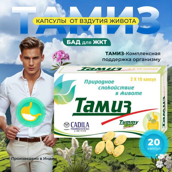 Tamiz, capsules, bloating, constipation, digestive discomfort, abdominal pain, gas, meteorism, colic, functional dyspepsia, IBS, gut health, bowel regularity, natural remedy, herbal supplement, gluten-free, lactose-free, seniors, post-covid, Cadila.