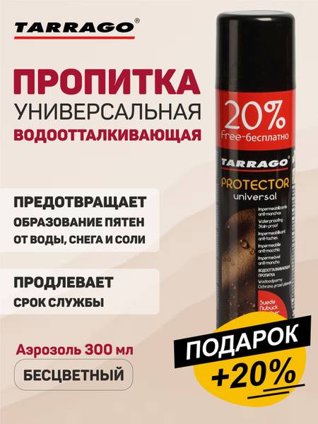 Keywords: Tarrago Protector Universal, Waterproofing spray, Water repellent spray, Shoe protector, Clothing protector, Bag protector, Leather protector, Suede protector, Nubuck protector, Velour protector, Membrane protector, Stain protection, Water stain protection, Fluorinated resin, 300ml, Aerosol, Colorless, Breathable, Durable, Long-lasting