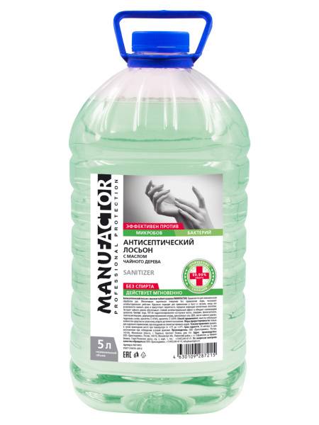 MANUFACTOR alcohol-free antiseptic lotion with tea tree oil provides thorough hand hygiene without water. Its powerful antibacterial action is ideal for on-the-go use when handwashing isn't possible, offering protection against the spread of infection through contact. Tea tree extract delivers lasting antibacterial benefits and a refreshing scent. Perfect for home use and situations where hygiene is critical. This 5-liter bulk size is perfect for businesses and large families.