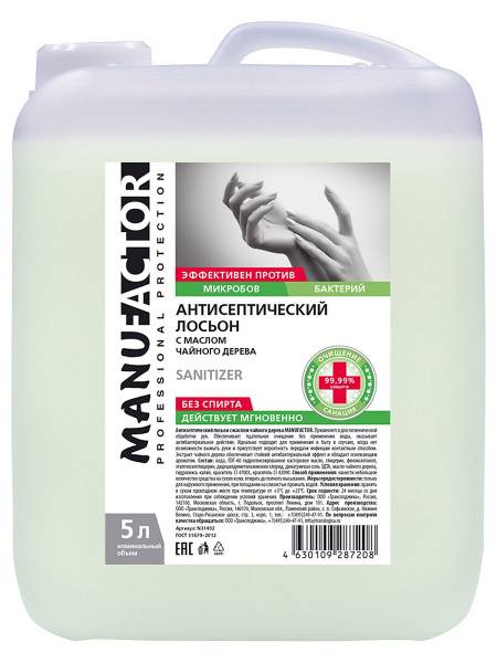 Description: MANUFACTOR Alcohol-Free Tea Tree Oil Antiseptic Lotion provides thorough hand hygiene without water. Its powerful antibacterial action, enhanced by tea tree oil extract, offers long-lasting protection against germs. Ideal for on-the-go use when handwashing isn't possible, this lotion effectively reduces the risk of infection spread through contact. Enjoy the refreshing scent of tea tree oil while ensuring superior hygiene. 5-liter bulk size perfect for homes, businesses, and institutions.