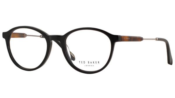 Experience sophisticated style with the Ted Baker Blaine 8228 001 eyeglasses. These sleek, round frames boast a classic English design, perfect for the modern gentleman. The glossy black plastic is accented by a subtle, stylish brown tortoiseshell and silver metal detail on the temples, showcasing Ted Baker's signature attention to detail. Weighing only 22 grams, these lightweight frames offer exceptional comfort. The "Raise Your Glasses" inscription on an inner temple adds a unique touch.