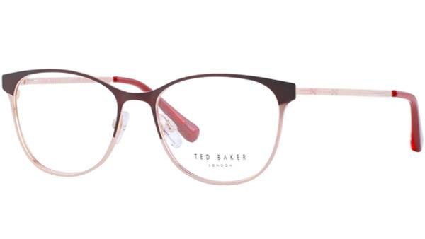 Elevate your style with the Ted Baker Nyla 2242 244 eyeglasses, a sophisticated pair of butterfly-shaped frames designed for the modern woman. These stunning frames feature a deep burgundy (almost brown) exterior with a striking gold metallic undertone, creating a luxurious and feminine contrast. The slender, aesthetically pleasing temples are delicately embossed, adding a touch of refined detail.
