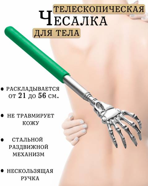 Reach any itch, anytime, anywhere! This telescopic back scratcher extends from 22cm to a generous 58cm, providing effortless relief from hard-to-reach itches. Crafted from durable metal with a fun "Skeleton" design in green, this handy tool offers a satisfying scratch and gentle massage. Its compact folded size makes it perfect for travel or keeping in your bag. Say goodbye to frustrating itches and hello to comfortable relief!