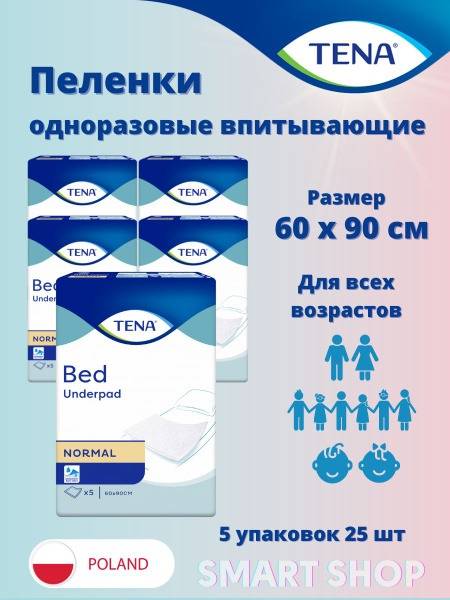 Description: TENA Bed Normal disposable underpads are medical-grade, hypoallergenic bed protectors. Their top layer's hypoallergenic properties are dermatologically tested. These versatile underpads offer superior protection for beds, furniture, and other surfaces from leaks and moisture during incontinence episodes, hygiene procedures (with diapers, absorbent underwear, and incontinence pads), diaper changes, and various treatments. The pads effectively absorb and distribute fluids. A soft, cotton-like top layer ensures comfort, while a waterproof backing prevents leaks. Each pad measures 60 x 90 cm. This pack contains 5 individually wrapped packs of 5 underpads each (total 25 underpads).