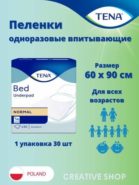 TENA Bed Normal disposable underpads are medical-grade, hypoallergenic incontinence pads, dermatologically tested for sensitive skin. These versatile, absorbent underpads provide reliable protection for beds, furniture, and other surfaces from leaks and spills associated with incontinence and hygiene care. Ideal for use with diapers, absorbent underwear, and incontinence pads, they offer superior fluid absorption and distribution. Made with a soft, cotton-like top layer for comfort and a waterproof backing to prevent leaks. Each pack contains 30 underpads, measuring 60 x 90 cm. Ensure superior protection and comfort with TENA Bed Normal.