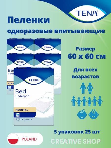 TENA Bed Normal disposable underpads offer superior protection and comfort for incontinence care. These clinically proven, hypoallergenic underpads feature a soft, cotton-like top layer that's dermatologically tested for sensitive skin. Providing reliable protection against leaks and spills, they're ideal for use with diapers, adult briefs, and incontinence pads during changes and hygienic procedures. The highly absorbent core effectively draws and distributes fluids, while the waterproof backing prevents leakage onto furniture and bedding. Each pad measures 60x60cm, and this bulk pack contains 25 underpads (5 packs of 5). Ensure peace of mind with TENA's trusted quality and superior absorbency.