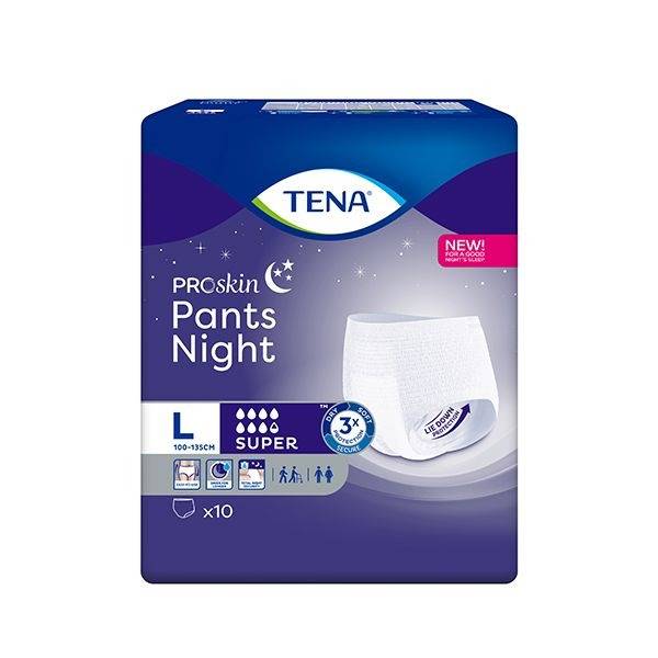 Experience ultimate overnight protection with TENA Pants Night Super Large absorbent underwear. Designed for superior comfort and dryness during sleep, these pants are ideal for a waist size of 100-135cm. Made by the trusted Swedish brand TENA, these dermatologically tested adult diapers provide reliable absorbency and are available in packs of 10.