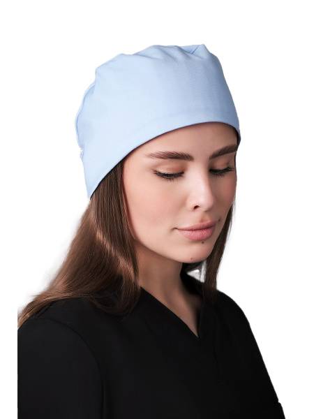 Medical bouffant cap, medical cap, surgical cap, disposable bouffant cap, healthcare cap, hairnet, doctor's cap, nurse's cap, medical headwear, adjustable cap, comfortable cap, elastic cap, Tesys TZ001, light blue cap, polyester cap, viscose cap, spandex cap, Russia made, unisex cap, mask loop cap, button cap, terry cloth lining.