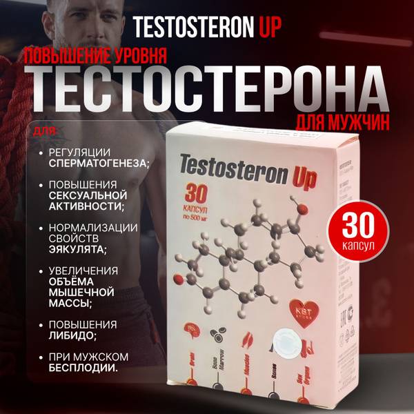 Testosterone Up is a natural herbal complex designed for men to support healthy testosterone levels and overall well-being. Formulated with androprotective plant extracts and essential vitamins and minerals, it works to regulate androgen hormones, normalize dihydrotestosterone (DHT) synthesis, and improve various aspects of men's health. Benefits include: improved libido and sexual function, enhanced sperm production and ejaculate quality, increased muscle mass and strength, boosted energy levels and mood, reduced fatigue, and support for fertility. Suitable for men aged 18 and over, Testosterone Up helps maintain a healthy hormonal balance, promoting better physical and mental performance. Each bottle contains 30 capsules (500mg each). Store below 25°C, away from direct sunlight and heat. Nutritional information per 100g: Protein 3.6g, Fat 1.2g, Carbohydrates 1.7g, Organic Acids 4.2g. Energy value: 52.4 kcal/219.34 kJ.