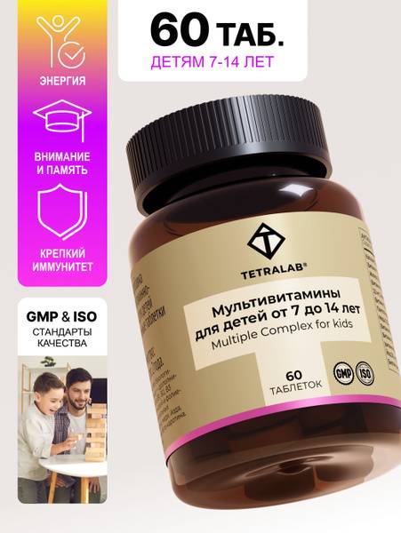 TETRALAB Multivitamins for Children and Teenagers (ages 7-14) provide comprehensive nutritional support for healthy growth, development, and a strong immune system. This specially formulated complex delivers essential vitamins and minerals, including Vitamins C, D3, E, B vitamins, calcium, zinc, magnesium, and iron. These key nutrients contribute to strong bones, muscles, improved blood circulation, and optimal energy levels. Antioxidants like Vitamin C, selenium, and beta-carotene help bolster the immune system, protecting against infections and promoting overall well-being. GMP and ISO certified for quality and safety, TETRALAB Multivitamins are a reliable choice for supporting your child's active lifestyle and overall health. Simply chew one tablet twice daily after meals for a recommended one-month course, repeatable as needed.