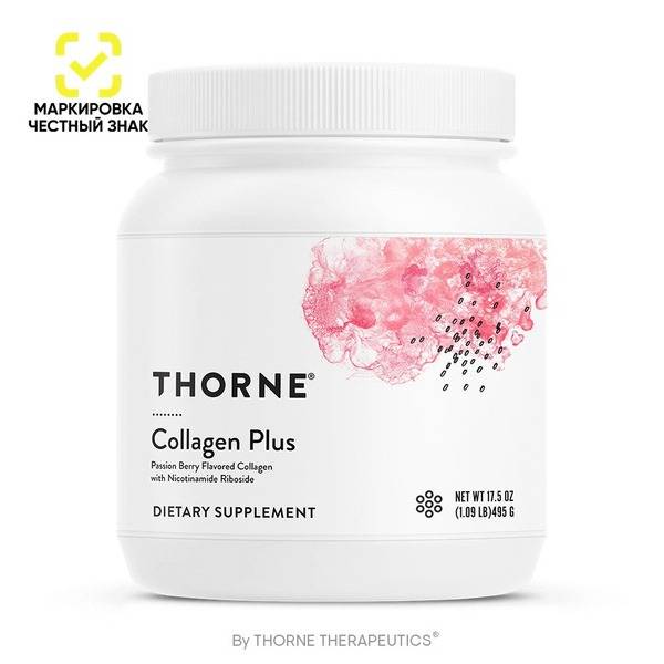Thorne Research Collagen Plus (495g) combines hydrolyzed collagen peptides, nicotinamide riboside, and a proprietary blend of polyphenols from black and red currants, and white peach extract. This delicious passion fruit-flavored powder supports skin, hair, and nail health from within. Clinically studied ingredients help improve skin hydration, elasticity, reduce the appearance of fine lines and wrinkles, and promote a youthful glow. Noticeable improvements in skin, hair, and nail health are often seen within four weeks. Consult your physician before use, especially if pregnant, breastfeeding, or have known allergies. Store in a cool, dry place out of reach of children. Do not exceed recommended dosage.