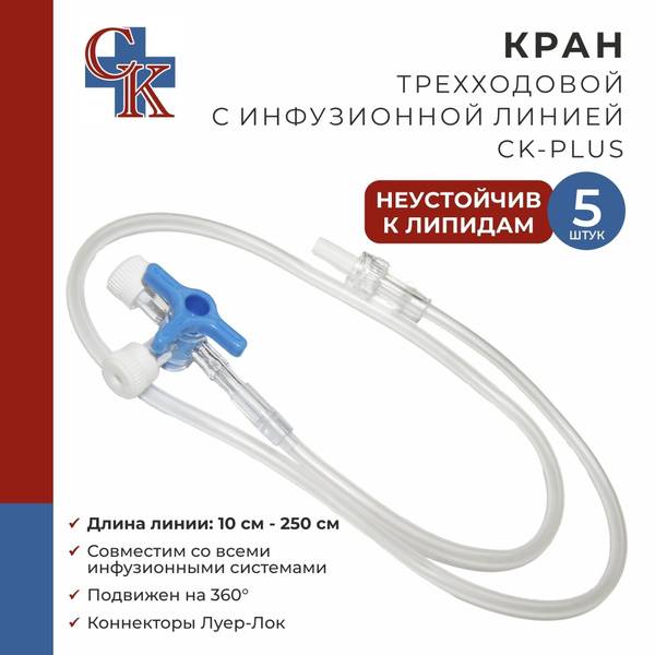 This listing features a 5-pack of CK-PLUS three-way stopcocks, each equipped with a 50cm infusion line. These robust and reliable stopcocks are designed for precise fluid control in various medical and laboratory settings. Please note that these stopcocks are not resistant to lipids. Ideal for applications where lipid-resistance is not a critical factor, these stopcocks offer a cost-effective solution for managing fluid flow. Each stopcock is manufactured to rigorous quality standards for dependable performance. Order your pack of five today.