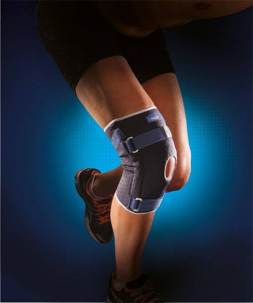 knee brace, knee support, neoprene knee brace, stabilizing knee brace, THUASNE, sport knee brace, ligament support, knee pain relief, knee injury prevention, rehabilitation, athletic knee brace, patellar stabilization, bicentric hinges, adjustable straps, velcro closure, medical device, sports injury, post-surgery recovery, knee compression, pain relief, orthopedic support.