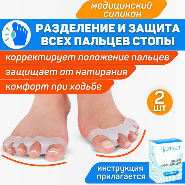 Our toe separators' anatomical design encourages proper toe alignment, relieving pain and tension in the forefoot. They reduce swelling, soften calluses, and prevent new blisters. The protective silicone cushions at the base unload pressure from the metatarsal heads, preventing their divergence caused by high heels or prolonged standing. Improved blood circulation and proper foot function are promoted by maintaining a natural toe position. These separators also act as a gentle foot massager. They can be used during pedicures as toe spreaders, providing comfortable and effective separation for nail care.