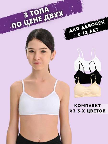 This Trendy Me 3-piece girls' top set is a wardrobe essential for growing girls. The comfortable bralette is perfect for everyday wear, sleepwear, or lounging at home. The sporty top is ideal for dance, gymnastics, or school. The soft, breathable cropped top is designed with teenage girls in mind. The bralette features removable push-up pads for versatile wear, easily adjusted to suit individual needs. This comfortable, wire-free top with foam padding is perfect for smaller busts, and stretches to comfortably fit chest sizes 65cm, 70cm, and 75cm. While the straps aren't adjustable, they're stretchy and designed for girls aged 8-12 (height 128-152cm). The soft elastic and neat seams ensure it remains invisible under clothing. Made from a thick, opaque cotton that holds its shape after washing, this set is an excellent choice for a girl's first bra. The set includes white, black, and beige (milk) tops, providing a versatile option for any occasion at a great price. Suitable for girls aged 8-12, and heights 128cm, 134cm, 140cm, 146cm, and 152cm.