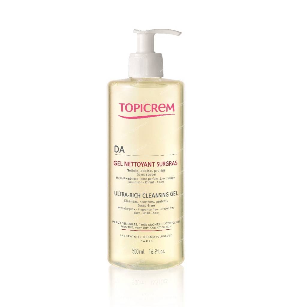Keywords: TOPICREM AD, Ultra Rich Cleansing Gel, atopic skin, eczema, very dry skin, hypoallergenic, fragrance-free, soap-free, sensitive skin, gentle cleansing, soothing, lipid-replenishing, flaxseed oil, biolipids, allantoin, dermatologically tested, pediatrician approved, ophthalmologist tested, safe for babies, children, adults, buy now, price, 500 ml.