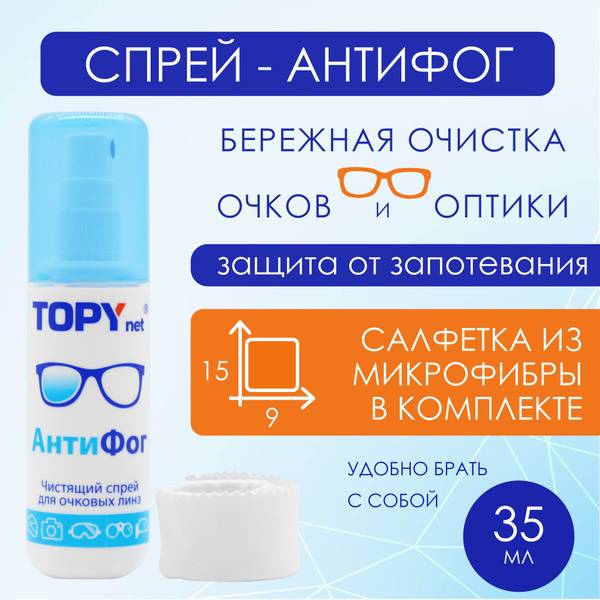 Eliminate fog on your glasses, swim goggles, ski masks, and more with Topynet Anti-Fog Spray. This 35ml bottle cleans, de-greases, and leaves an anti-static finish on all lens types. The anti-static properties help reduce dust and dirt accumulation, keeping your lenses cleaner for longer. Includes a microfiber cleaning cloth.