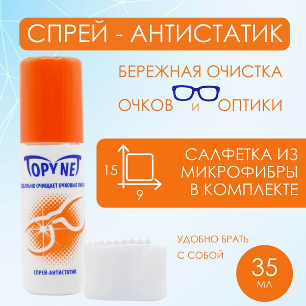 Keep your glasses sparkling clean and dust-free with Topynet Anti-Static Spray. This effective cleaner removes grease and prevents static buildup on all lens types (organic, mineral, plastic). Includes a microfiber cleaning cloth (9x15cm). Available in 35ml and 120ml sizes.