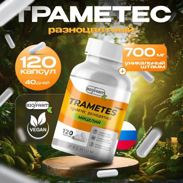 Experience the remarkable power of nature with BIOFARM's Trametes Versicolor (Turkey Tail) mushroom extract, a superior supplement trusted for over 5 years. This highly prized medicinal mushroom is packed into convenient 700mg capsules. Each daily serving of three capsules provides 2100mg of potent Trametes Versicolor extract – significantly more than comparable products offering only 600mg.