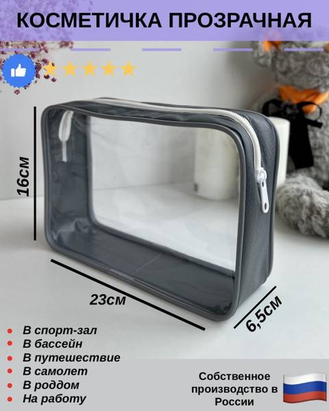 Keywords: travel cosmetic bag, transparent cosmetic bag, waterproof cosmetic bag, airtight cosmetic bag, TSA approved, travel toiletries bag, makeup bag, gift bag, maternity hospital bag, PVC cosmetic bag, Russian made cosmetic bag, grey cosmetic bag, durable cosmetic bag, reinforced seams, 23x16x6.5 cm