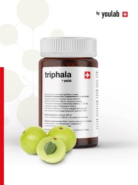 Triphala, YouLab, Ayurvedic supplement, detox, digestive health, gut health, immunity, Amla, Bibhitaki, Haritaki, Phyllanthus emblica, Terminalia bellirica, Terminalia chebula, 60 capsules, 600mg, natural wellness, herbal supplement, Ayurvedic medicine, digestion support, detoxification support, immune support.