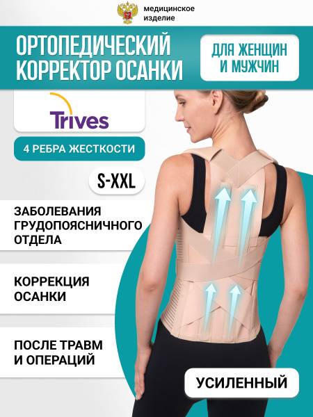 The Trives medical-grade posture corrector offers comprehensive support and correction for various spinal issues. Featuring four strategically placed support ribs (two long, two short), a comfortable lumbar pad, and adjustable straps, it provides targeted relief and gradual posture improvement. Ideal for: