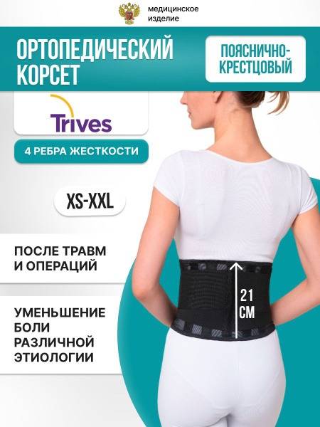 Experience superior back pain relief with the Trives semi-rigid orthopedic corset. Featuring 4 flexible metal stays for targeted lumbar support, this comfortable and breathable corset provides gentle stabilization and pain relief for various conditions including osteochondrosis, spondylosis, spondyloarthrosis, radiculitis, myositis, and post-surgical recovery. Its elastic, skin-friendly design ensures all-day comfort, while the double closure system offers adjustable compression. Ideal for back pain management, injury prevention during physical activity, and post-operative recovery. 21cm width. Hand wash only. Composition: 45% Polyamide, 20% Elastane, 20% Polyurethane, 15% Polyester, Metal Stays (0.5mm).