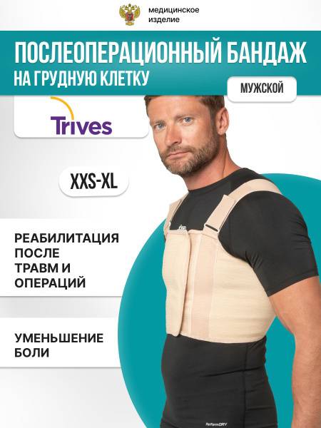 "description": "The Trives T.23.09 men's post-surgical chest support bandage provides effective pain relief and promotes healing after chest or abdominal surgery. Made from a soft, breathable, hypoallergenic cotton blend (53% cotton, 31% polyester, 16% elastane), this anatomical bandage offers comfortable, adjustable compression. Ideal for post-operative recovery, rib injuries, and muscle strain, it reduces pain, aids in wound healing, and facilitates proper breathing. Features include adjustable shoulder straps for secure fitting, and easy closure. Gentle hand washing recommended. Consult your doctor for proper usage and duration.",